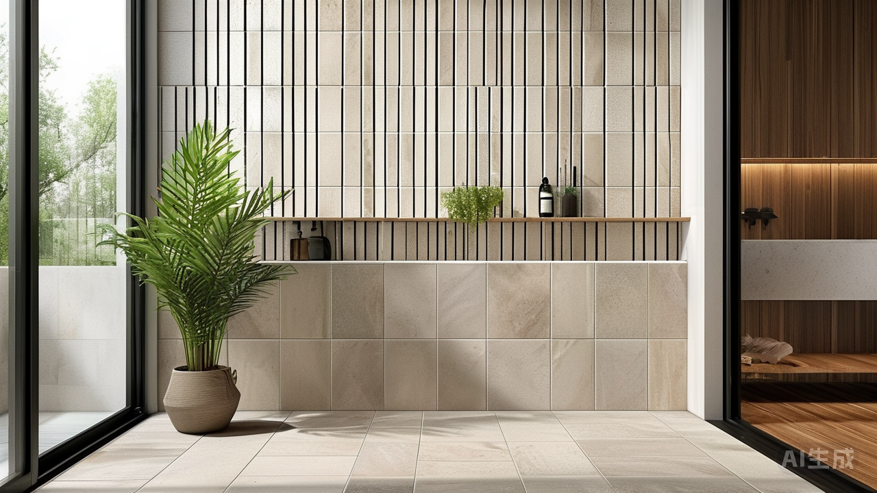 除了常规方形外,还有长方形的特殊比例值得玩味。比如厨房防溅墙常用的300×450mm竖条砖,纵向拉伸能在视觉上拔高空间高度;阳台区域则适合用细长的木纹砖横向排列,模拟地板效果的同时兼顾防水性能。而卫浴湿区专属的防滑小地砖,表面凹凸肌理配合紧凑尺寸,正是安全保障的关键所在。