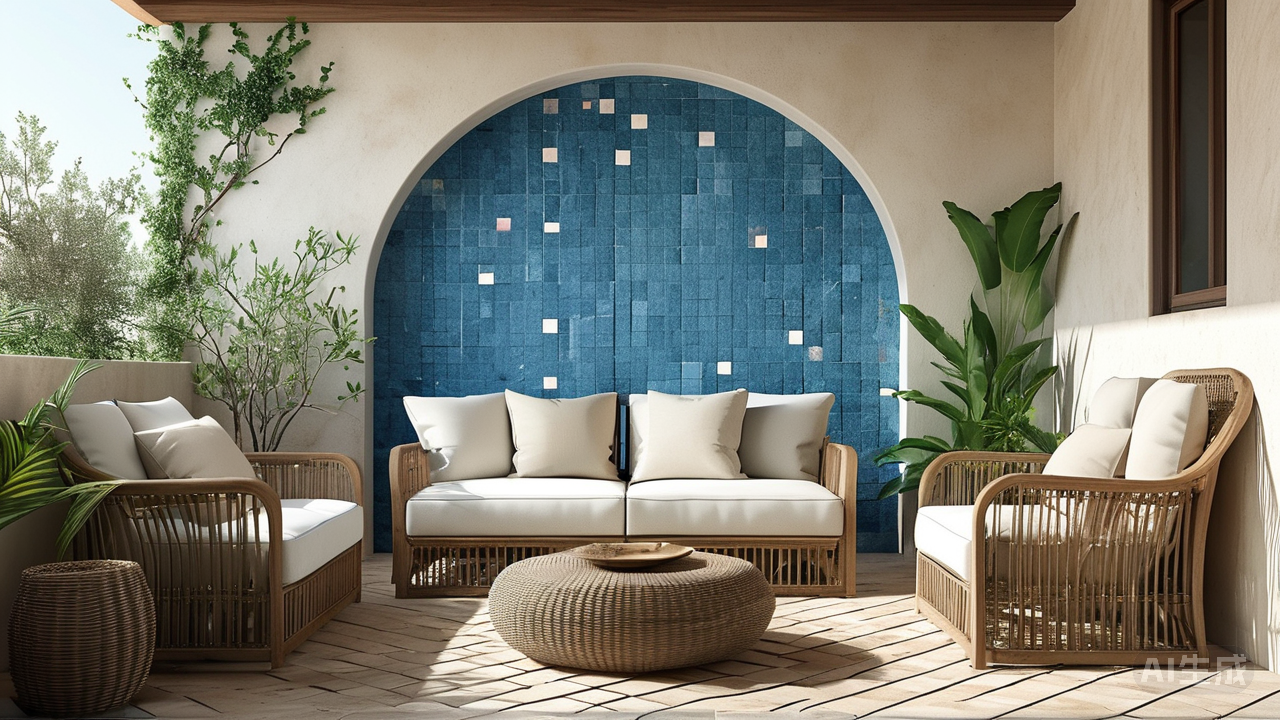 地中海风格同样钟情于小规格瓷砖的魅力。蓝白为主色调的色彩体系下,小块的哑光或半抛釉面瓷砖宛如爱琴海边的鹅卵石,散发着浓郁的自然海洋气息。客厅背景墙以深浅不一的天蓝色小方砖错落镶嵌,中间点缀白色十字缝线,仿佛海浪拍打礁石留下的泡沫轨迹;阳台区域的地面选用米黄色菱形小砖斜向铺贴,模拟阳光洒在沙滩上的斑驳光影。木质家具、藤编饰品与绿植围绕四周,进一步强化了悠闲惬意的度假氛围。小规格瓷砖在这里不仅是功能性铺装材料,更因其活泼的色彩跳跃感和灵动的造型变化,完美契合了地中海风格的浪漫特质,使人仿若置身希腊圣托里尼岛的白色小屋之中。