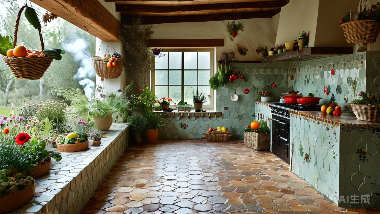 田园风讲究质朴与自然共生,小规格瓷砖亦是绝佳拍档。仿石材纹理的小地砖,如砂岩质感的米灰色、页岩花纹的棕褐色系,常应用于乡村风格的庭院小路或者室内入口玄关处。粗糙不平的表面保留了天然岩石原始触感,边缘略微起伏的形状增添了手工打造的真实感。卧室飘窗台周边用六角形的小瓷片围合而成,淡雅的草绿色调融入周围的碎花窗帘和亚麻布艺沙发,打造出春日田野般的清新意境。甚至一些带有花卉图案手绘的小瓷砖,直接作为厨房防溅板使用,蔬果采摘篮挂在上方,炊烟袅袅升起时,满是生活的烟火气与大自然的亲密交融。