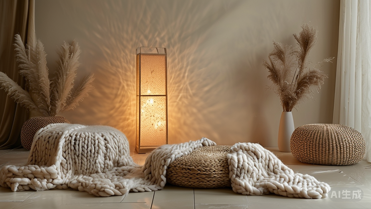 光在此刻成了最温柔的调温师。傍晚时分,低矮的落地灯散出柔和光晕,如同暮色里悄然燃起的一盏炉火。灯下,厚实的羊毛毯慵懒地铺展于瓷砖之上,似将炉火暖意凝于足下;藤编的坐墩与亚麻靠枕随意散落,共同吸纳着光线,为冰冷的地面注入一层温润的光泽。柔光与织物一同作用,在硬质表面上晕染开温暖的视觉涟漪,使冰冷的地板也仿佛升起了氤氲的温度。