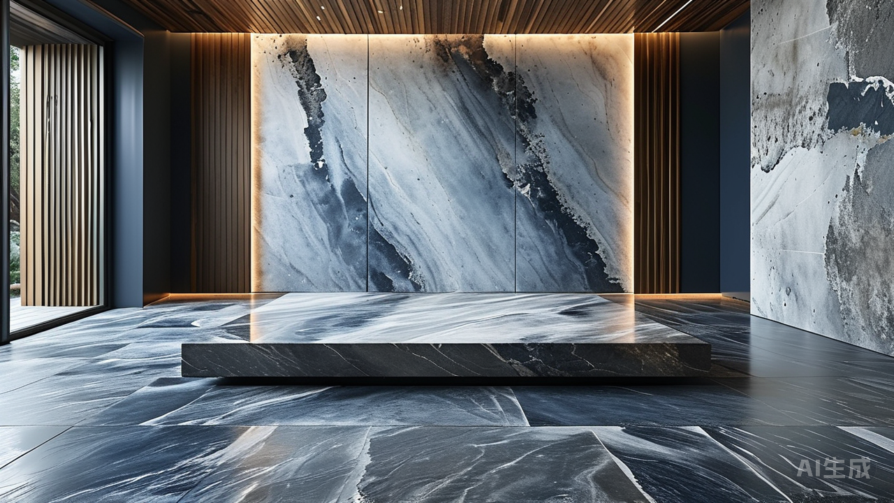 这庞然的尺度,更是为材质肌理提供了完整的叙事舞台。天然石材的磅礴脉络、素雅微水泥的静谧质感,抑或是高光岩板的深邃光泽——当它们不再被狭小的边界框定,其内在的美学能量才得以彻底释放。一整片如同泼墨般奔涌的大理石纹路在脚下延展;一道深沉而温润的木纹肌理在墙面从容铺叙。材质的语言被完整保留、放大,成为空间中不容忽视的视觉主角,无声传递着设计的力量与温度。空间的每一寸肌理都得以自由呼吸,形成连贯的情绪基调。