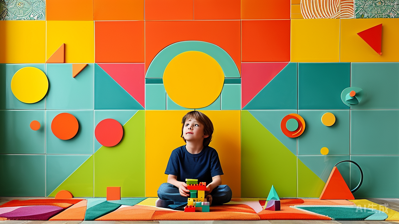 儿子的活泼天性则在电视墙下方找到欢快的出口。设计师避开童稚的卡通,选用抽象几何的明快乐章:跳跃的三角、旋转的圆环、充满张力的折线,在亮黄、鲜橙与薄荷绿的瓷砖上碰撞。这几何游戏并非随意泼洒,其节奏暗藏律动,呼应着他拆解玩具时的专注神情。他常坐在地毯上,仰视这片色彩天地,小手握着积木,在现实与瓷砖的几何世界中搭建自己的小小王国。这些形状是他的活力图腾,无声守护着纯真的探索脚步。