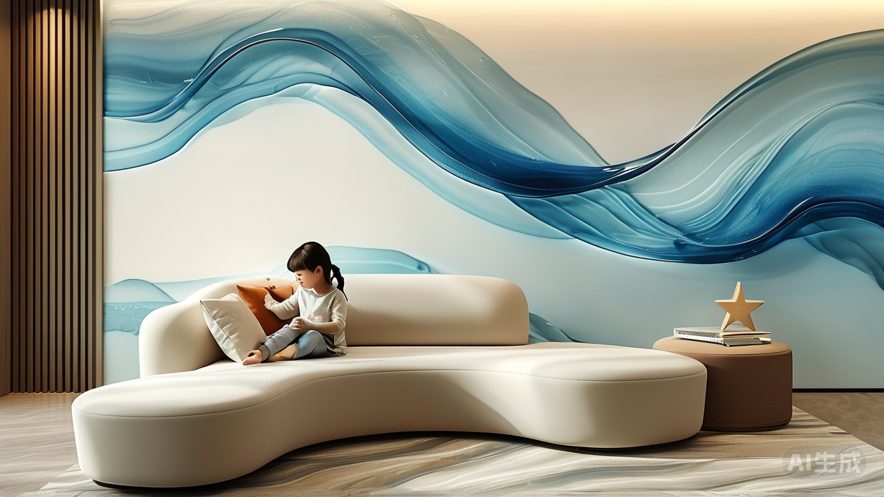 当视线转向客厅转角,女儿迷恋的水波纹路便自然流淌开来。并非生硬的图案排列,设计师捕捉了水最生动的瞬间:漩涡的微妙动态、水滴溅起的轻盈张力,都被凝练于靛青与乳白的渐变釉色之中。这些线条并非静止,它们如真水般拥有韵律,阳光下折射出湿润光泽。她总爱依偎在沙发角落,指尖在墙面的涟漪上轻轻划过,仿佛能听见童年里溪水潺潺的清澈回响——那是独属她的心灵港湾。