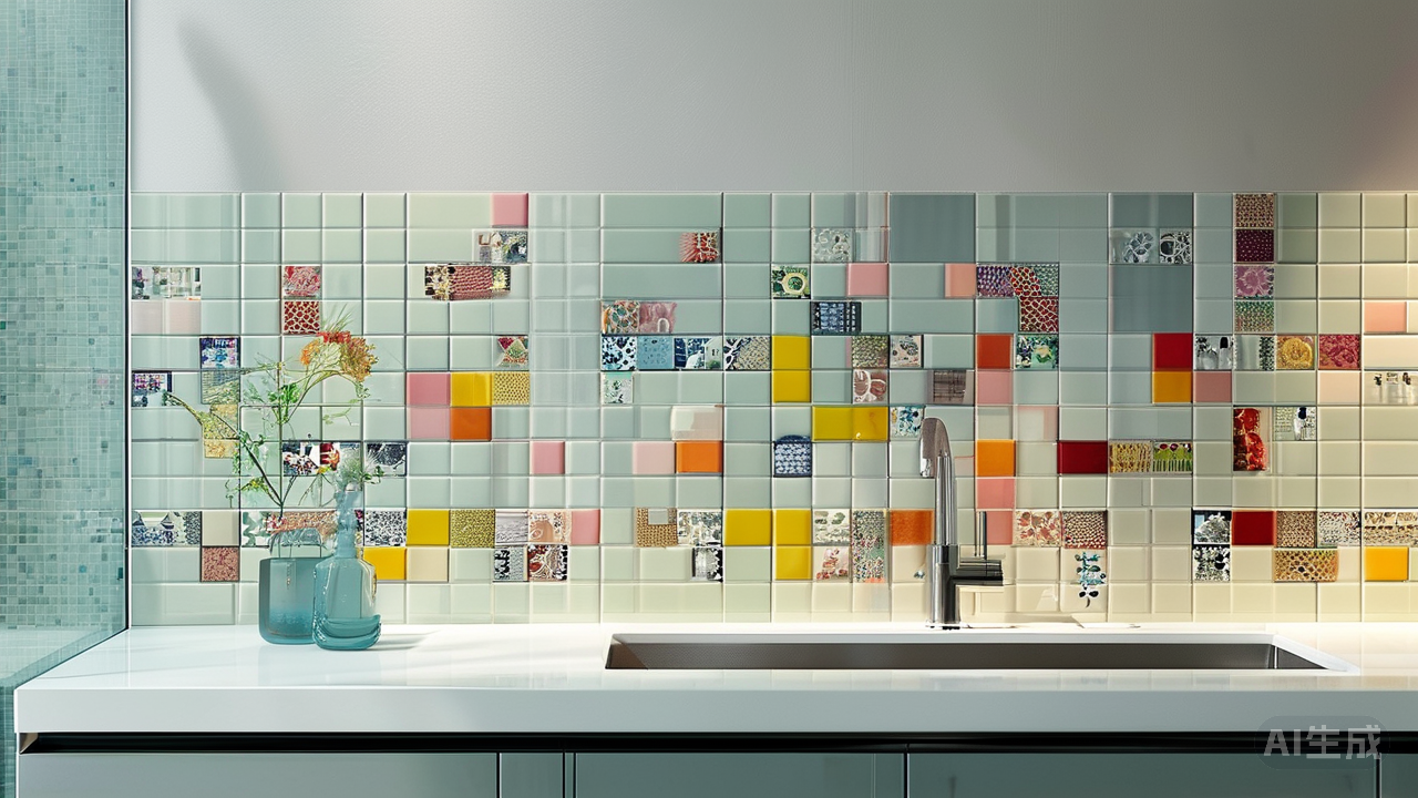 厨房油烟之地,实用之外亦可藏巧思。操作台后的背景墙,正是小规格花砖的妙用舞台。远离明火的干燥区,选择几列色彩明快、图案活泼的花砖,如蓝白几何纹样,错落嵌入素净的纯色墙砖中。洗切时抬眼,这一抹清新跳出,恰似乐章中的灵巧变奏,消解了操作区的机械感,让烟火日常也透出艺术气息。 至于卫生间,细节处最见心思。摒弃整墙的视觉疲劳,只取淋浴区壁龛内里或盥洗台镜框四周,以纯白小方砖为底,嵌入一两排釉面莹润的彩色马赛克或异形花砖。水汽氤氲中,那抹孔雀蓝或蜜糖橘的渐变釉色,仿佛雨后被阳光穿透的琉璃,折射出细碎光华。它不抢镜,却让每一次低头掬水都成为与美的邂逅。