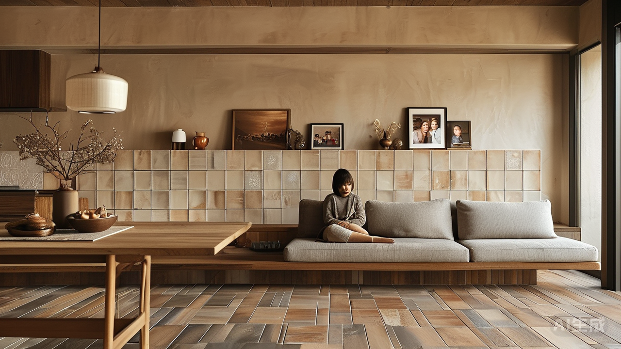 材质的语言:触感定义功能 材质的转换是最高级的分区手法之一。当脚步从一种触感迈向另一种,功能区域的转换便自然而然地完成了。 想象一下,步入一个开放式的客餐区。客厅是家人慵懒小憩的核心地带,温暖与舒适是首要诉求。这里,可以选择木质纹理的哑光瓷砖或温润的仿古砖。木纹砖自带天然的亲和力,哑光质地光感柔和,光脚踩上去也不会觉得冰冷,瞬间营造出放松、温馨的氛围。而仿古砖略带粗糙的质感,则增添了一份沉稳与时光的韵味。