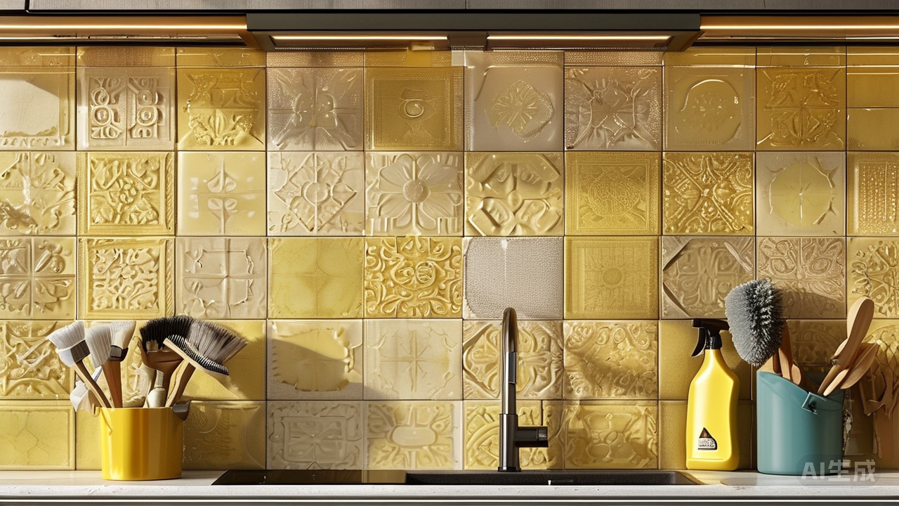 避雷指南: 无论如何,一定要索要实物小样!在自然光和室内灯光下分别观察颜色和质感,用手触摸表面,检查平整度。将几片样品拼在一起,看图案衔接是否流畅,有无明显色差。不要迷信商家的精修图,眼见为实是铁律。 翻车现场二:中看不中用,清洁维护成噩梦 博主家那凹凸有致的立体纹理砖,光影交错,艺术气息拉满。小B果断跟风,用在了厨房墙面。结果,炒菜产生的油烟迅速附着在每一个凹槽里,日积月累,形成了难以清理的油垢。每次打扫卫生都堪比一场噩梦,刷子、清洁剂齐上阵,也回不到最初的洁净。同样,一些表面有细微孔隙的哑光砖、仿古砖,如果不注意釉面质量,极易渗色,一杯咖啡洒上去可能就留下永久的印记。