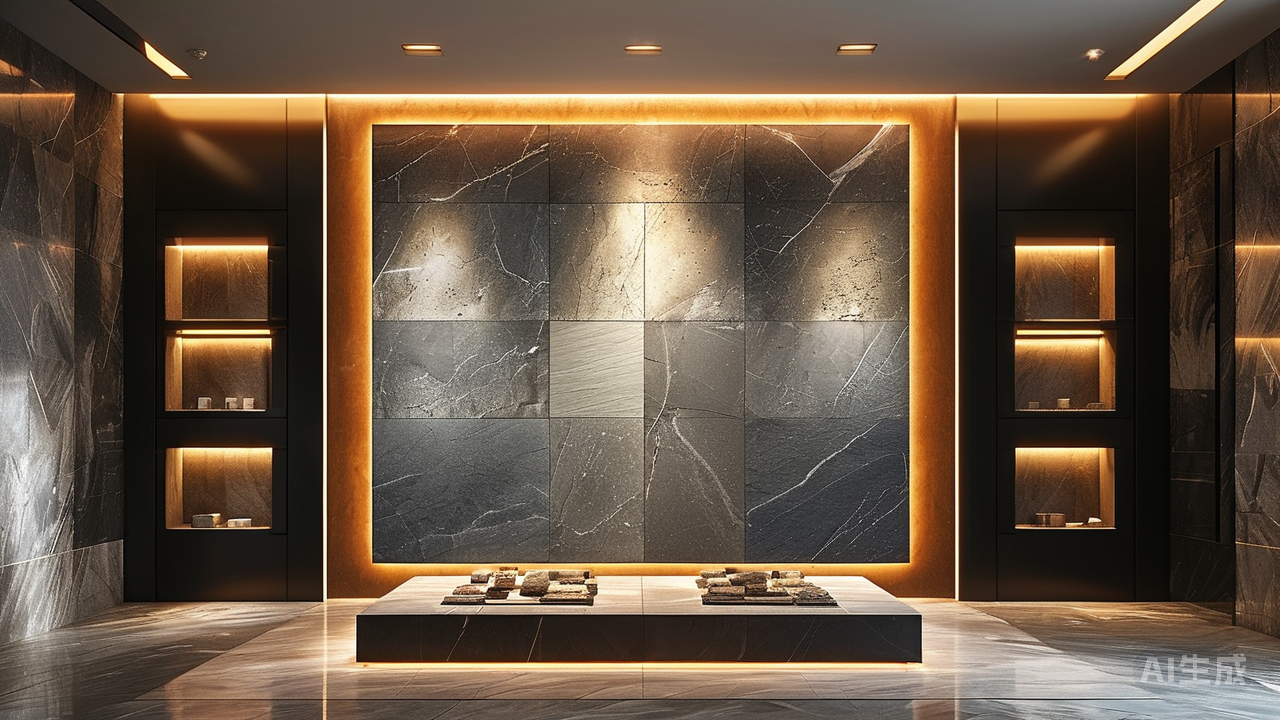 奢石系列瓷砖的展厅设计,如何通过场景化陈列展现其极致奢华在竞争激烈的建材市场中,奢石系列瓷砖以其独特纹理、珍稀材质与卓越工艺,占据着高端装饰材料的金字塔尖位置。而其展厅设计,绝非简单产品堆砌,应是一场沉浸式奢华体验之旅,借场景化陈列,将品牌灵魂与产品魅力深植观者心间。 踏入展厅,仿若步入一座隐秘贵族府邸,前厅以低调深邃暗色调为基底,柔和暖光灯带勾勒墙面轮廓,光影交错间,一块巨型奢石瓷砖端坐中央展示台,宛如镇宅瑰宝。它那天然石纹似山川河流蜿蜒流淌,细腻金丝银线闪烁其间,灯光轻抚,折射出灵动光泽,瞬间定格全场焦点,无声宣告:“奢华,自此启幕。”四周壁龛内,小型奢石样本错落摆放,配合精细射灯,凸显每片瓷砖独特肌理——或是如孔雀开屏般绚烂斑斓,或是静谧深海蕴含无尽神秘,让访客初步领略材质之美。