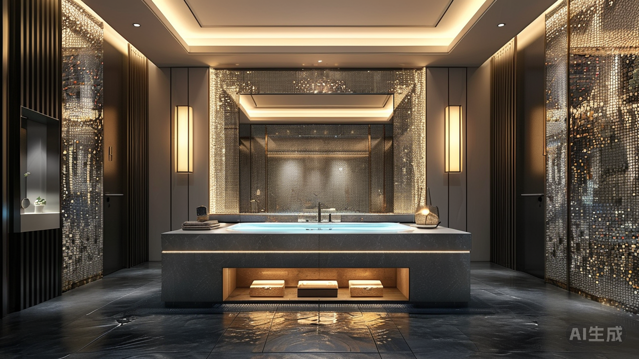 卫浴空间堪称私密奢华殿堂。浴缸置于中央,周边环绕一圈发光灯带,水面波光粼粼反射至墙面米黄色玉石纹瓷砖,光影摇曳,舒缓身心;洗手池台面一体成型,弧线优美,台下储物柜门镶嵌金属拉手,开合顺滑静音。镜前灯带均匀布光,消除面部阴影,便于梳妆打理;侧墙马赛克拼花图案别致,由细小碎钻般金色瓷片组成,在局部灯带烘托下,熠熠生辉。地面防滑处理后的深色奢石,脚感踏实安稳,排水坡度设计隐匿无形,于细微处见匠心。