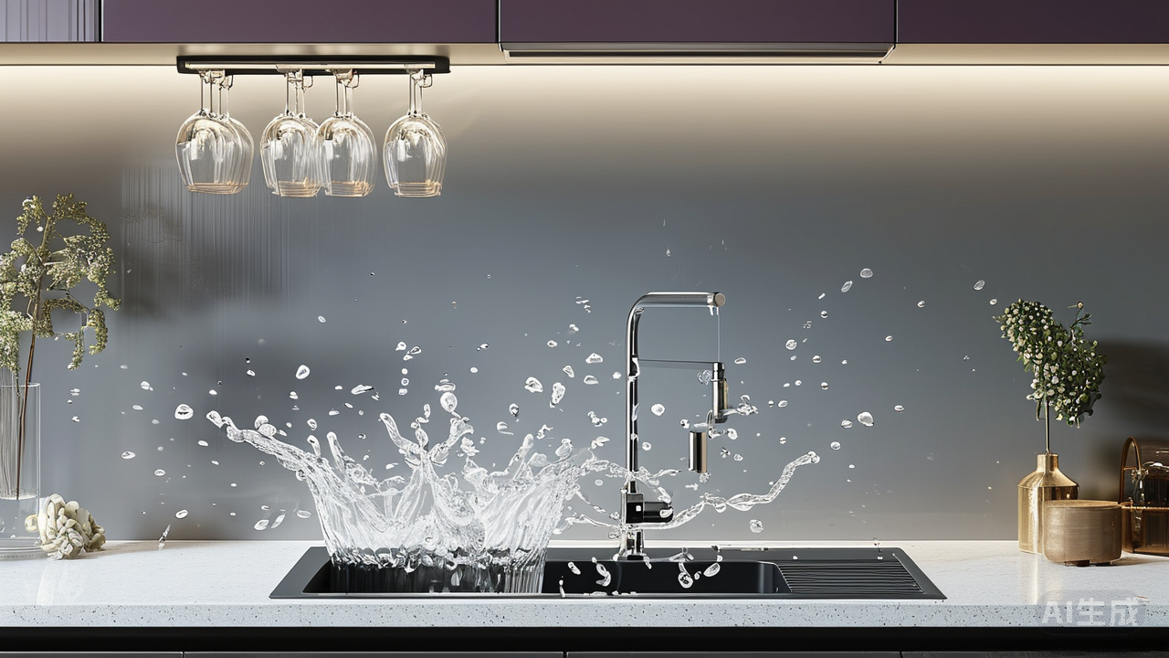 厨房区域,岛台成为视觉核心。台面精选耐高温、抗污渍黑色大理石纹奢石,切面利落流畅,水槽嵌入其中,水滴溅起,滑落痕迹清晰可见,彰显超强实用性能;侧面挡板则是晶莹雪花白石英石,纯净底色散落淡雅灰紫絮状纹路,与对面电器墙形成冷暖撞色。橱柜门板采用高光烤漆工艺,亮泽度媲美镜面,把手为水晶材质,开合之际,清脆声响回荡,搭配顶部悬挂水晶杯具,点滴细节汇聚,诠释现代奢华厨房理念。头顶悬浮式吊顶嵌入条形射灯,光线聚焦操作台面,无阴影死角,方便烹饪同时,强化空间层次感。