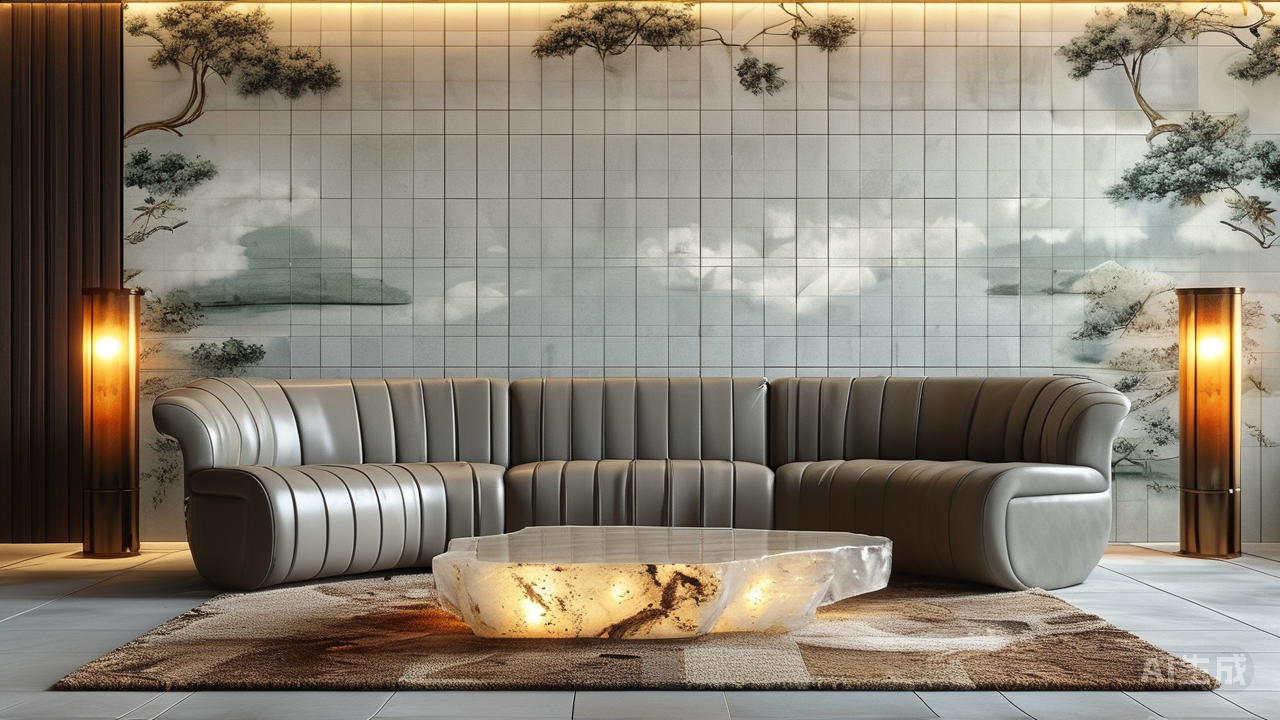 移步客厅模拟区,整体空间布局还原真实生活场景,却处处透着精致考究细节。地面通铺大规格奢石瓷砖,浅灰色调云朵图案连绵延展,恰似漫步云端,软绒地毯边缘与之精准拼接,触感温差对比下,更显瓷砖温润质地。一组弧形真皮沙发呈围合式摆放,背靠艺术手绘墙,画面色彩与奢石纹理巧妙呼应;茶几是整块半透明树脂包裹原石造型,内置灯光穿透,映照下方瓷砖纹理,虚实相生,营造梦幻氛围。角落落地灯柱选用古铜色金属,雕刻复古花纹,散发暖黄光晕,为这方天地添一抹温馨,暗示此间日常即非凡享受。